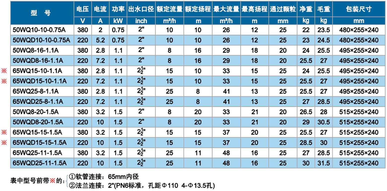 WQ系列双流道潜水排污泵结合了国内外同类优秀产品,经过PCAD软件优化设计而成,在水力模型、结构、密封、冷却和保护控制等方面进行了综合优化和创新设计。叶轮为双流道设计,有较大的进口和出口宽度,无堵塞性能好,高效节能,安全可靠,寿命长。